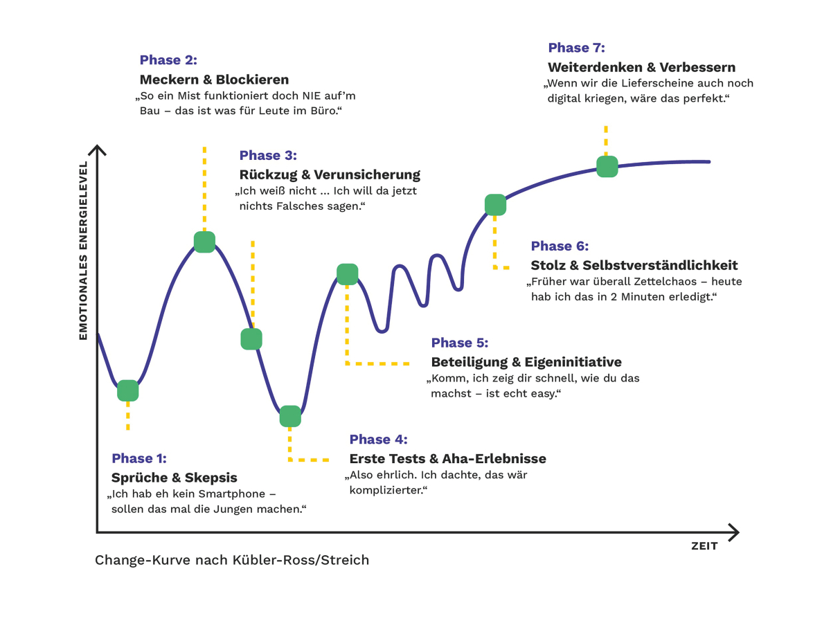 Die sieben Phasen der Veränderung – wie Software-Einführung auf Baustellen wirklich verläuft