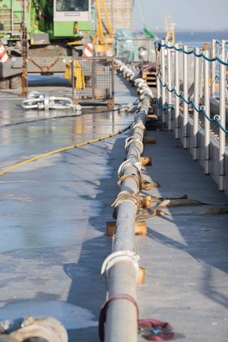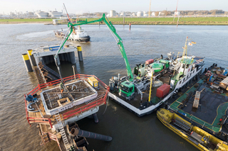 Erweiterung des Schlepperhafens in StadeIm laufenden Schiffsbetrieb wurde in Stade der Schlepperhafen erweitert. Über eine 400 Meter lange Rohrleitung und mithilfe einer eigens eingesetzten Autofähre lieferte Heidelberg Materials Spezialbetone in konstant hoher Qualität.