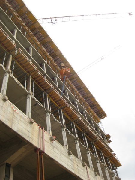 Weil mit dieser Konstruktion stets zwei der jeweils 4 m hohen Etagen gleichzeitig eingerüstet sind, kann in der unteren Etage bequem und sicher ausgeschalt werden, während gleichzeitig im darüberliegenden Geschoss die Einschalarbeiten (Deckenflächen und Stützen) stattfinden. So geht es Takt für Takt über 20 Etagen bis auf 85 m Höhe. Als Deckenschalung für den Erweiterungsbereich wird die trägerlose Modulschalung Topec eingesetzt; die Unterzüge werden mit der Holzträgerschalung Topflex hergestellt.