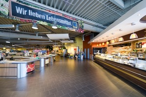„Die Verlängerung des Stadtraums in den rückwärtigen Teil des Grundstücks,“ erklärt Architekt Frank Degener die Planung, „war wichtig, um für den sozusagen im Hinterland angesiedelten Supermarkt die notwendige Kunden-Akzeptanz zu erreichen. Jetzt sagen die Anwohner: ‚Ich geh’ mal in den schicken Supermarkt einkaufen....’.“ Damit werde für die Menschen, die durch innerstädtische Shopping-Center verwöhnt sind, auch hier das Einkaufen zum Erlebnis. Auch das Innere unterscheidet sich vom gewohnt zweckmäßig geprägten Ambiente anderer Supermärkte: Die Mall im Eingangsbereich führt vorbei an Shops und einem Bäckerei-Café mit einladendem Sitzbereich und Außenterrasse in den loftartigen Verkaufsraum. Auf 1900 m² stehen hier etwa 22.000 verschiedene Artikel, darunter Biolebensmittel sowie polnische und türkische Waren für die Kunden bereit. Lager- Kühl- und Nebenräume sind im rückwärtigen Teil des Gebäudes angeordnet. Die Anlieferung erfolgt dezent und für die Kunden unsichtbar über eine Rampe auf der Rückseite des Gebäudes.