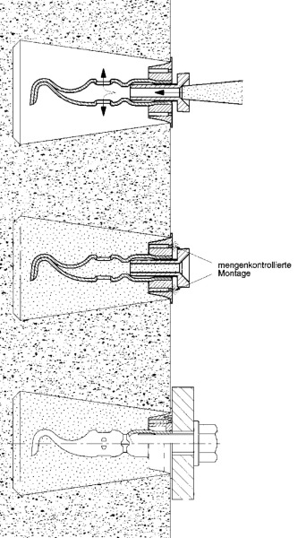 2-5) als Einsteckelement und einer injektionsfähigen Mörtelmasse. Als Mörtelmasse werden schnellbindende Mörtel mit mineralischem Bindemittel oder zweikomponentige Reaktionsharzmörtel verwendet. Sie wird entweder vor dem Einbringen des Einsteckelementes oder durch das Einsteckelement selbst in das Bohrloch gepresst. Nach entsprechender Aushärtezeit besteht ein Verbund zwischen Einsteckelement und Injektionsmasse und somit eine spreizdruckfreie Verankerung zur Lasteinleitung in das Mauerwerk. Bei hinterschnittener Bohrlochherstellung wird zusätzlich zum Verbund eine formschlüssige Verbindung zwischen Mörtelmasse und Bohrlochwandung hergestellt (Bild 2-6). In hinterschnittene Bohrlöcher können auch spezielle Kunststoffdübel eingesetzt werden, die beim Aufbringen eines Drehmomentes auf die Befestigungsschraube in den Hinterschnittbereich des Bohrloches aufspreizen (Bild 2-7).