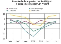 Ein weiterer Sonderfall ist mit Deutschland zu verzeichnen. Nach den zehn Jahren der Baurezession von 1995 bis 2005 erwiesen sich die deutschen Bauinvestitionen seit 2006 als stabilisierendes Element in Europa. Da immer noch knapp 20 % der europäischen Bauproduktion auf Deutschland entfallen, stützte Deutschland in den letzten drei Jahren die baukonjunkturelle Entwicklung in Europa. In zehn kleineren westeuropäischen Ländern setzte die Baurezession erst 2009 ein, war in den letzten beiden Jahren mit einem addierten Rückgang von real 12 % aber relativ ausgeprägt. Diese Ländergruppe soll allerdings 2011 schon wieder in die Wachstumszone zurückkehren.