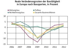 Nach drei Jahren der Rezession, in der die realen Bauinvestitionen in Europa um insgesamt 15 % zurückgegangen sind, erwartet die Euroconstruct-Gruppe (19 Länder) für 2011 eine Bauproduktion auf dem Vorjahresniveau. Für 2012 wird mit einem preisbereinigten Wachstum von 2 % gerechnet. Allerdings läge selbst dann das Volumen noch um etwa 200 Mrd. Euro unter dem Produktionsniveau des Jahres 2007.