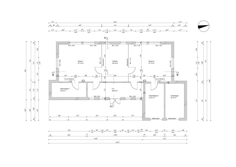 n Großer Wert wurde auf die Umsetzung des Wunsches der Schule gelegt, im Freien – geschützt unter einem Dach – an größeren Objekten bauen und so den Werkunterricht ergänzen zu können. Die durch den großen Dachüberstand geschaffene Fläche beträgt rd. 68 m².
