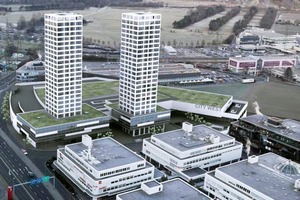 Sind mastgeführte Kletterbühnen eher als Arbeitsplattformen zur Fassadenmontage konzipiert, ist die zügige vertikale Beförderung von Mensch und Material an Gebäuden entlang die Aufgabe von Personen-/Lastenaufzügen. Zu diesem Zweck sorgen an den entstehenden 24 Stockwerken der „Twin Towers“ zwei Alimak Scando 650 Bauaufzüge für schnellen und sicheren Höhenzugang. Je nach Konfiguration transportieren diese Nutzlasten bis über drei Tonnen bzw. erreichen Geschwindigkeiten bis 65 m/min. Interne Diagnosegeräte, Überlastsicherungssysteme und frequenzgeregelte Motorensteuerung für sanftes Starten und Stoppen bringen mit dem Alimak Scando 650 den Bedienkomfort moderner Hotelaufzüge auf die Baustelle. Hochwertige Getriebe und Motoren bedeuten geringen Verschleiß, liefern höchste Präzision beim Anfahren der Haltestellen und ermöglichen somit optimalen Zugang zu den Etagen. Durch die bekannte Modularität der Produkte aus ISO-zertifizierter schwedischer und niederländischer Herstellung passen sich sowohl mastgeführte Kletterbühnen von Hek als auch die Alimak Scandos an jedes Bauprojekt an.