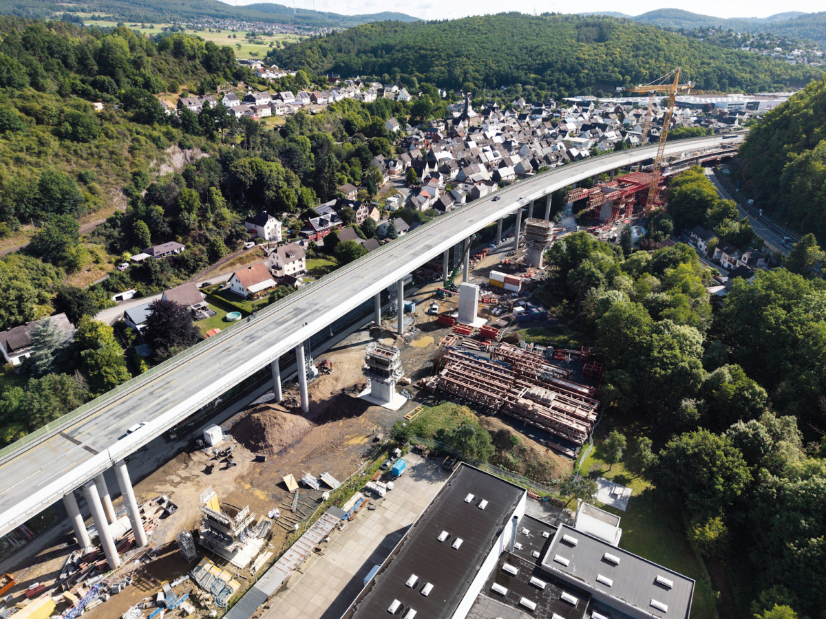 Wie so viele Autobahnbrücken in Deutschland weist auch die Talbrücke Sechshelden an der A 45 zwischen Dillenburg und Haiger erhebliche altersbedingte Abnutzungen auf und muss ersetzt werden. Die alte Brücke soll bei laufendem Verkehr abgerissen und neu gebaut werden. Das Projekt bringt dabei zahlreiche Herausforderungen mit sich. Eine davon ist seine Lage: Das Baufeld liegt dicht am Ortsrand von Sechshelden, teils in steiler Hanglage und eingerahmt von einer Bahnlinie, dem Fluss Dill und einer Bundesstraße – was Arbeiten unter äußerst beengten Platzverhältnissen bedeutet.