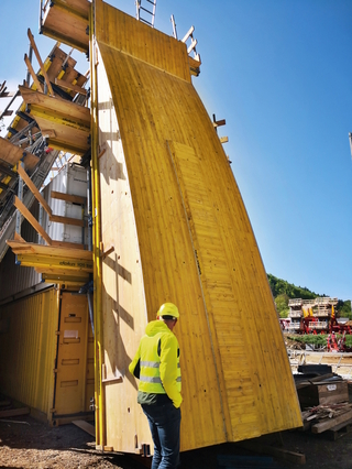 Eine weitere Herausforderung sind die Dimensionen. Die neue Brücke ist rund 930 Meter lang, die neue Fahrbahn ruht auf 14 Pfeilern je Fahrtrichtung, mit massiven Fundamenten und hohen Widerlagern mit Vouten an den Überbaufeldern. Das konstruktive Niveau ist hoch, ebenso wie der Anspruch an das Schalungsbild bestimmter Bauwerksteile, besonders an die aufgeweiteten Pfeilerköpfe mit genau vorgegebener Oberflächenstruktur. Hinzu kommen ein enger Zeitplan sowie logistische Einschränkungen. Schalung, Traggerüst und Sicherheitstechnik – alles muss zur richtigen Zeit am richtigen Ort sein, und das in enormen Mengen.
