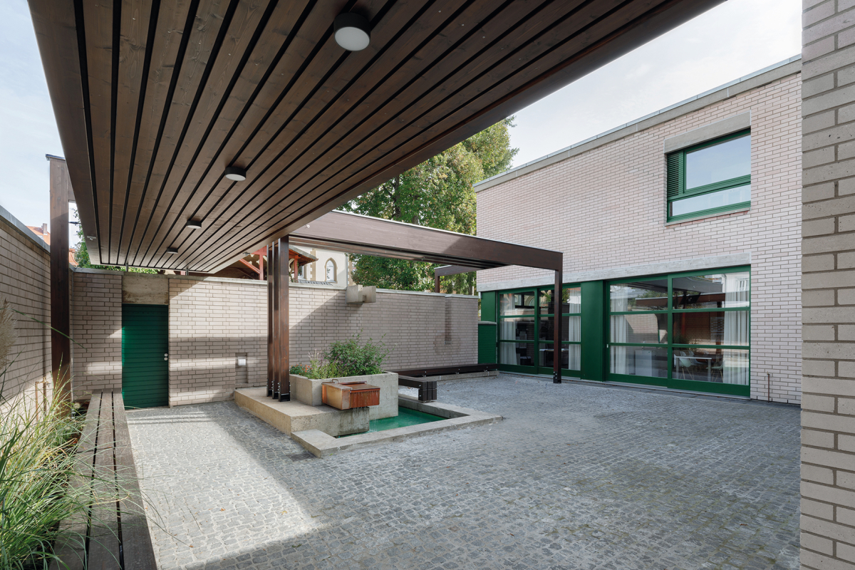 Während sich das Gebäude der einstigen Nutzung entsprechend zur Straßenseite geschlossen präsentiert, öffnet es sich zum privaten Innenhof