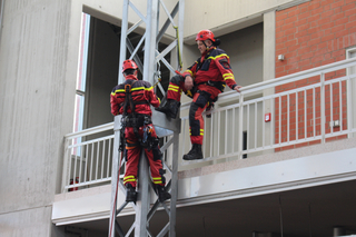 Die Höhenretter der Feuerwehr Dortmund zeigten während des Fachkongresses für Absturzsicherheit 2024 in der DASA in Dortmund praxisnahe Rettungsübungen