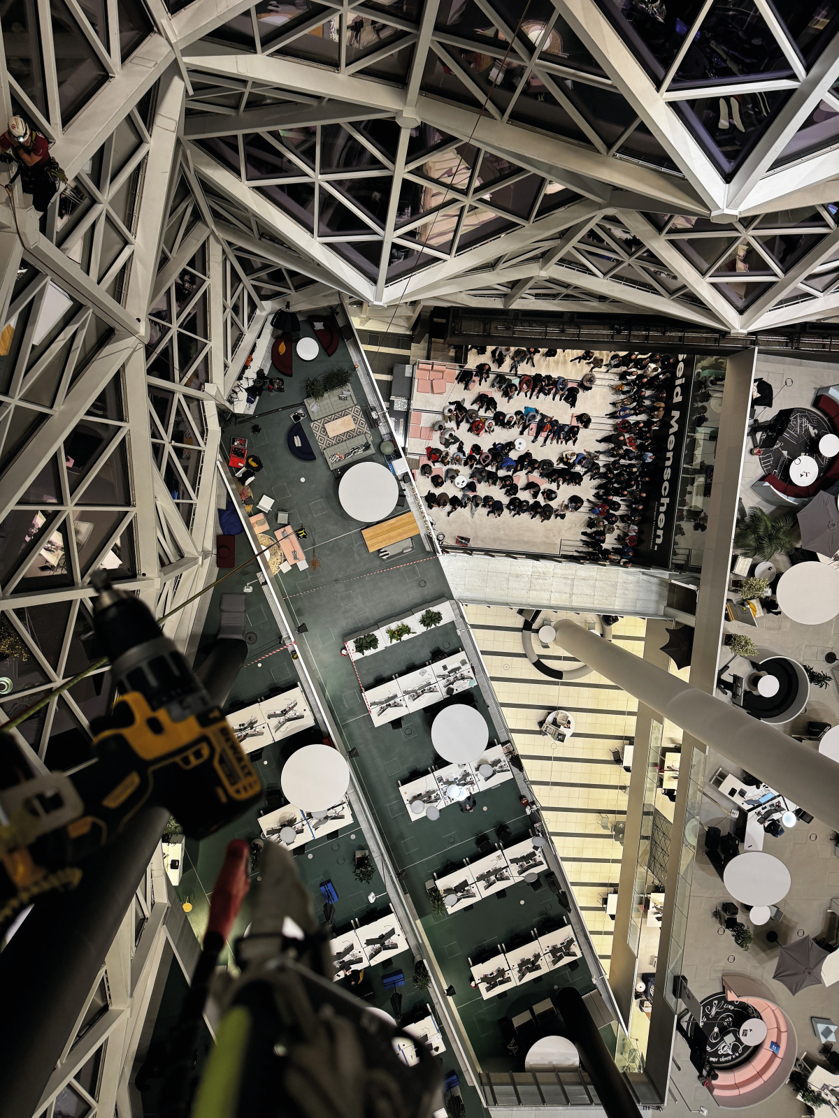 Am 25. und 26. November 2025 trafen sich rund 200 Fachleute und Interessierte aus Planung, Bau und Gebäudebetrieb auf dem 9. Deutschen Fachkongress für Absturzsicherheit – diesmal in Berlin. Neben einem umfang- und abwechslungsreichen Vortragsprogramm stand auch eine Exkursion zum Axel-Springer-Campus auf dem Programm. Dort erwartete die Teilnehmenden eine Live-Demonstration zum Thema „Höhenarbeit an der Fassade“ durch das Ingenieurbüro Hochsicher und die Mittelmann Sicherheitstechnik GmbH & Co. KG. Dabei entstand das Foto aus einer Höhe von gut 45 Metern mit Blick auf die Exkursionsgruppe.