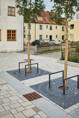 Mit diesen Sicherheitspuffern ausgestattet, gelangt ausschließlich unbedenkliches Regenwasser über Drainageleitungen zum eigentlichen Baumquartier. Dort sorgt ein Baumschutz- und -bewässerungssystem des Nottulner Herstellers Humberg für konstant stabile Wachstumsbedingungen des Stadtgrüns. Es besteht aus einem Stahlgerüst mit Betonfundament, das mit einem durchwurzelbaren Baumsubstrat verfüllt ist. Luftklappen ermöglichen eine Rundumbelüftung des Pflanzraums und stellen den Gasaustausch sicher. Dies verbessert die Fähigkeit der Wurzeln, Wasser und Nährstoffe aufzunehmen. Bei anhaltender Trockenheit lässt sich das System zudem von oben bewässern, sodass die Bäume auch in regenarmen Zeiten ausreichend versorgt sind.