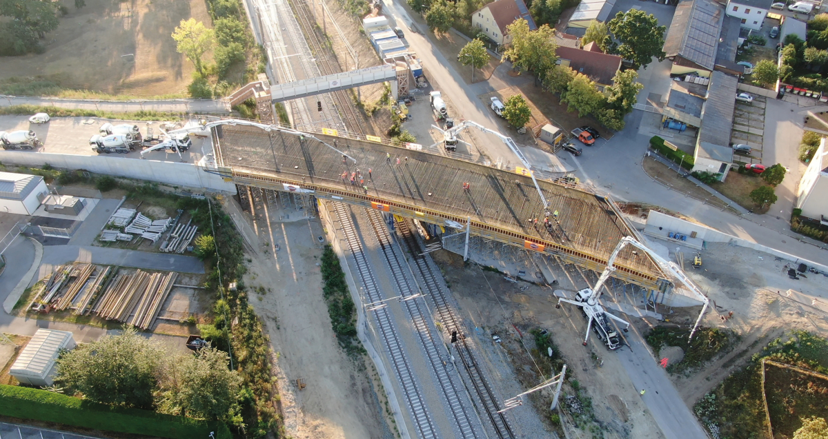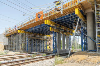 Die neue Brücke, die die Nordbahn-Strecke überspannt, wurde an die geänderten Dimensionen angepasst. Nach dem Abbruch der alten Konstruktion errichtete die Baustellenmannschaft mit der Rahmenschalung Framax Xlife zwei Widerlager und drei Brückenpfeiler. Für die Herstellung der Rundungen der 13,48 Meter langen und 100 Zentimeter dicken Pfeiler kam zudem die Stützenschalung RS zum Einsatz. Die Schalungshöhe betrug bis zu 8,70 Meter.