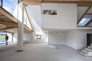 Andreas Krause hat viel Eigenarbeit in das Projekt investiert. Gemeinsam mit Freunden und Helfern entkernte er den Altbau, entfernte alte Tanks und legte bei allen Gewerken selbst Hand an. Im Bestandsgebäude stehen die Ziegel im Mittelpunkt. Unzählige einzelne Ziegel wurde abgetragen, gereinigt und wiederverwendet, sodass sämtliche sichtbare Ziegel im Bestand original sind. Insgesamt wurden etwa 5.000 dieser speziellen Ziegelsteine verwendet, die aufgrund ihres seltenen Klosterformats nicht anderswo erhältlich waren. Für den Dachstuhl griff Krause auf Holz aus dem eigenen Familienwald beim Chiemsee zurück und schlug es eigenhändig. Ein zentrales Anliegen war die Verwendung massiver Baustoffe zur Dämmung, um zusätzliche Dämmmaterialien zu vermeiden. Die meterdicken Mauern des Altbaus benötigen keine zusätzliche Dämmung. Für den Hallenneubau fiel die Wahl auf Ytong Porenbeton. Der monolithische Baustoff erfüllt die Anforderungen an Schallschutz, Brandschutz, energetischen Wärmeschutz und Statik. Trotz seines geringen Gewichts verfügt Ytong über eine hohe Druckfestigkeit und Tragfähigkeit. Die homogene Struktur und die Möglichkeit, eine einzige Ytong-Steinvariante für alle Anforderungen zu verwenden, waren entscheidende Faktoren bei der Wahl des Materials. Die Fassaden aller Gebäudeteile wurden außen verputzt, während die Ytong-Steine der Halle im Inneren im rohen Zustand belassen wurden. Dadurch wirkt das Ensemble von außen homogen, während innen die strukturellen Unterschiede zwischen Alt und Neu sichtbar bleiben. Die Fenstergestaltung mit Rundbogenfenstern im Altbau und rechteckigen Formaten im Neubau hilft dabei, die Gebäudeteile außen voneinander zu differenzieren, während das Gesamterscheinungsbild im Einklang bleibt. Die Struktur des Altbaus wird durch einen vorgemauerten Sockel betont, der zur Stabilisierung beiträgt. Ein markantes Merkmal des Neubaus ist die Integration des ursprünglich freistehenden 20 Meter hohen Schlots der Brennerei, der nun Teil des Gebäudes ist und als Landmarke fungiert. Die Entscheidung für die Materialien ist bewusst auf das Wesentliche reduziert: alte Ziegel, Holz, etwas Beton, Stahl und Ytong. Cornelius Dier betont: „Von Anfang an war für uns klar, dass wir monolithisch bauen wollten. Unsere Entscheidung fiel sowohl aus praktischen als auch wirtschaftlichen Gründen auf Ytong. Die Beratung seitens Ytong war dabei überaus hilfreich.“