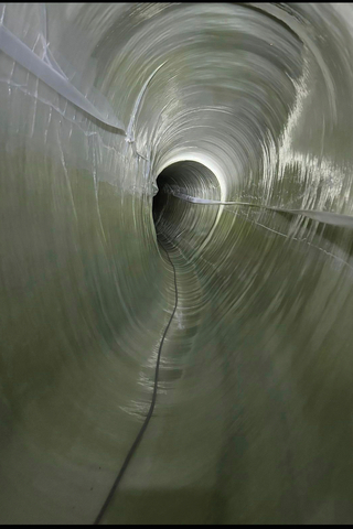 Im nächsten Arbeitsschritt erfolgte der Einzug einer Gleitschutzfolie. Sie verhindert einen Abrieb des Liners an der Betonwand, insbesondere bei Versätzen, Kurven oder Bögen. Danach wurde der bereits im Werk vorkonfektionierte Liner über einen Schacht mittels Winde in die Haltung eingezogen. Aufgrund des hohen Eigengewichtes der Liner kam hierbei zusätzlich ein Förderband zum Einsatz. Dann wurden die Liner-Enden mit einem Packer verschlossen. „Dies stellt einen gleichmäßigen Aushärtungsprozess sicher und dient gleichzeitig der Fixierung der Linerenden“, so Ebensberger. „Anschließend wird der Liner über diese Packer mit Druckluft aufgestellt. Luftkupplungen an den Packern dienen dem Anschluss von Verdichter- oder Kompressorschläuchen. Deshalb sind die Packer wichtig, damit der Liner sich formschlüssig an den Kanal anpresst und dicht abschließt.“ Darüber hinaus ermöglicht der Packer das präzise Platzieren des UV-Lichterkerns – er kam aufgrund der großen Geometrien anstelle einer UV-Lichterkette zum Einsatz – im Inneren des Liners und sorgt dadurch für eine gleichmäßige Aushärtung entlang der gesamten Haltung. Beim Einbau der Flexliner wurde der Lichterkern mit einem gummierten Ziehseil eingebracht, um eine exakte Führung sicherzustellen, ohne die empfindliche Oberfläche des Liners zu beschädigen.