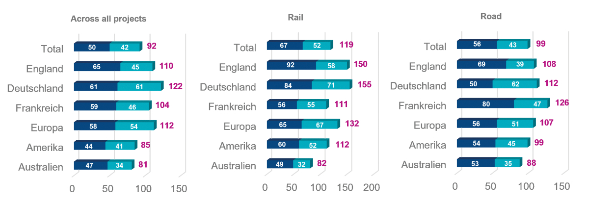 Die Abbildung „Internationaler Kostenvergleich bei Infrastrukturprojekten“ zeigt auf den ersten Blick nur geringe Unterschiede zwischen den Ländern. Diese Darstellung berücksichtigt jedoch lediglich die ausgeschriebenen Vergabepreise, nicht aber die tatsächlich angefallenen Projektkosten. Das bedeutet: Die Zahlen spiegeln nur die Kosten zum Zeitpunkt der Auftragserteilung wider, nicht die späteren Aufwendungen durch Bauzeitverzögerungen, Nachträge oder Planänderungen (Abbildung 1).