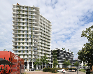 Der insgesamt vier Gebäudeteile umfassende Green City Tower am alten Zollhof in Freiburg vereint Büro-, Gastronomie- und Wohnflächen in einem einzigartigen Komplex. Während drei der Bauten über vier, fünf und sieben Etagen verfügen, erstreckt sich der imposante Wohnturm mit 53 Mietwohnungen verteilt über 15 Obergeschosse insgesamt 52 Meter in die Höhe.