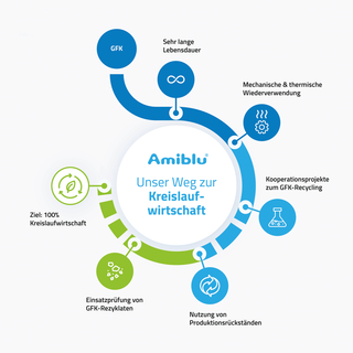 Als verantwortungsvolles Unternehmen geht Amiblu die mechanische und thermische Wiederverwendung von GFK nicht weit genug. Neben der aktiven Unterstützung verschiedener Forschungsvorhaben betreibt Amiblu daher auch eigene Forschungs- und Entwicklungsarbeit mit dem Ziel der vollständigen Kreislaufwirtschaft