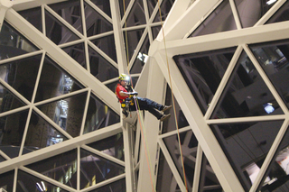 Dafür wurden 1.500 verdeckte Anschlagpunkte der Firma LUX-top und ein Schienensystem von Innotech montiert, wobei die Montage rund acht Monate dauerte. Für die Arbeit in der Höhe an der Fassade führen zwei Seile von oben nach unten, die Steuerung der Winde, ein System von der Firma Mittelmann („Infinity Axess“) durch die Höhenarbeiter erfolgt per Akkuschrauber. Eine Fahrt in die Höhe dauert dabei etwa vier Minuten. Die Wartungsarbeiten finden zweimal im Jahr statt, gearbeitet wird dabei in der Regel nach dem Vier-Augen-Prinzip – niemand fährt alleine nach oben.
