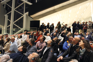 Der kollektive Blick nach oben: Die Exkursion in den Axel-Springer-Neubau begann mit einer Live-Demonstration zum Thema „Höhenarbeit an der Fassade“ durch das Ingenieurbüro Hochsicher und die Mittelmann Sicherheitstechnik GmbH & Co. KG