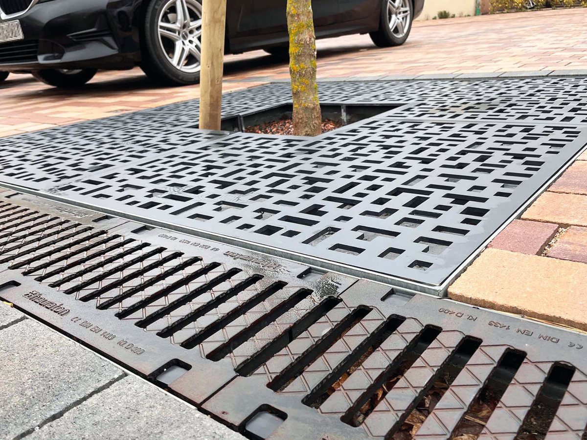 Trotz durchgängiger Befestigung der Oberfläche – unter anderem für Parkplätze und die künftige Ladeinfrastruktur – wurde ein funktionierendes System zur Baumbewässerung realisiert