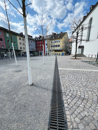 Friedrichshafen, Adenauerplatz: Das von den Verkehrsflächen gesammelte Wasser wird vor der Verwendung zur Bewässerung der Baumgruben gereinigt. Dies geschieht in der Drainfix Clean Rinne mit dem carbonathaltigen Filtersubstrat Carbotec 100