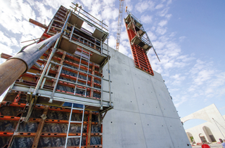 Léon legt Wert auf ein sicheres Arbeitsumfeld für seine Mitarbeiter. Der Aufbau von Arbeitsbühnen soll aber mit möglichst wenig Aufwand einhergehen. Daher entschied man sich, die Schalungslösungen gleich in Kombination mit der multifunktionalen Arbeitsplattform Multip einzusetzen. Die Gerüstkonsolen können bequem an den Schalelementen montiert werden, wenn diese noch am Boden liegen. Beim Umsetzen der Schalelemente wird die „Gerüst-Schalungs-Kombi“ einfach im Ganzen per Kran versetzt. „Die Arbeitsbühnen lassen sich mit wenigen Handgriffen an den Schalelementen befestigen. Einmal erledigt, erspart uns das während des Betonierens das Ab- und Anmontieren. So können wir mit Hilfe der Multip noch schneller ein- und ausschalen“, bestätigt Jungmichel.