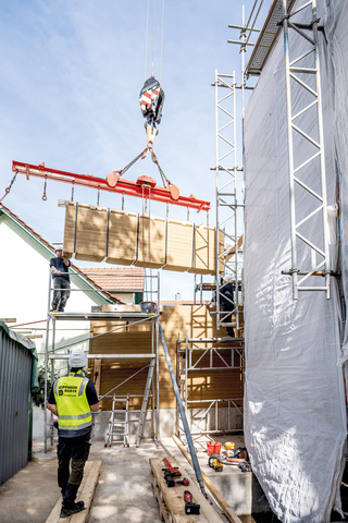 Insgesamt drei Wände wurden präzise aufeinandergesetzt und verdübelt – dank Vorfertigung schnell, planbar und nahezu geräuschlos
