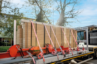 Nach dem kontrollierten Trocknungsprozess wurden die Lehm-Wandelemente mit Wechselbrücke und Traverse auf den Lkw geladen. Eine halbseitige Straßensperrung vor der Baustelle stellte ein reibungsloses Entladen sicher. An einem Mobilkran wurden die Elemente nacheinander angehängt und an die richtige Position gesetzt. Im Anschluss erfolgte die Montage unter der Leitung von Projektleiter und Lehmbauexperte Peter Gmeiner. Die drei Elemente wurden mit Dünnbettmörtel versetzt und verdübelt. Die Lehmstampfwand in Straubing bildet eine tragende Wand, die eine Zwischendecke trägt, auf der wiederum der Dachstuhl aufliegt. Die Lehmwand fungiert auch als Brandschutzwand zum Nachbargebäude, das sich nur einen Meter entfernt befindet. „Uns ist wichtig, zu betonen, dass Lehmbaustoffe heutzutage industriell vorgefertigt werden können. Dies macht Lehmprodukte mit ihren vielfältigen Eigenschaften für einen breiten Einsatz wirtschaftlich. Wichtig ist natürlich auch, dass wir die entsprechende Erfahrung in dem Transport von tonnenschweren Fertigteilen mitbringen und diese nun mit den Vorteilen des Lehmbaus verbinden“, betont Thomas Bader, Geschäftsführer von Leipfinger-Bader.