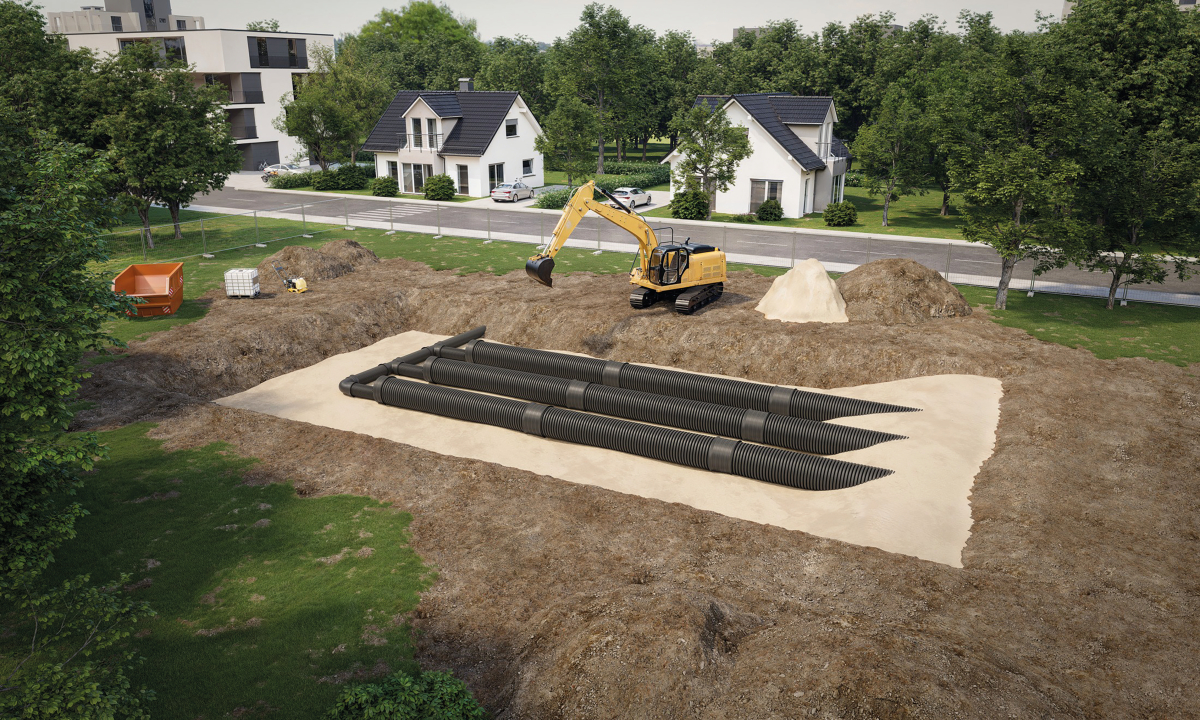 Mit seinem neuen Stauraumkanal-System auf Basis großer Verbundrohre vom Typ DN 800 präsentiert Fränkische eine platzsparende und effiziente Lösung für das Regenwassermanagement zur Vermeidung von Hochwassergefahren. Das System ermöglicht eine optimale temporäre Rückhaltung und kontrollierte Ableitung von Oberflächenwasser und schützt so nachgeschaltete Rohrsysteme und Vorfluter effektiv vor hydraulischer Überlastung. Ein entscheidender Vorteil gegenüber herkömmlichen Beton-Stauraumkanälen ist das problemlose Verlegen, selbst in beengten Straßenräumen, dicht bebauten Quartieren oder unter schwierigen Einbaubedingungen.