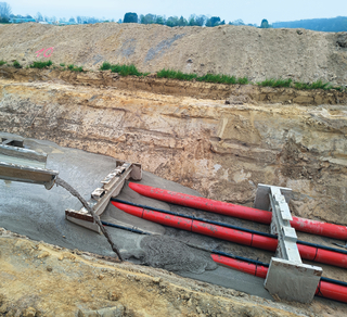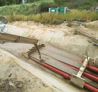 Die Vorteile der Flüssigbodenbauweise werden auch dann deutlich, wenn man einen Vergleich mit der konventionellen Verfüllung zieht. Hierzu Jana Simon: „Alternativ würde man die Leitungsgräben mit Sand verfüllen. Hierbei ist eine hohe Wärmeleitfähigkeit jedoch nur bei optimaler Verdichtung zu erreichen. Da Flüssigboden selbstverdichtend ist, gewährleistet dieser hier eine deutlich bessere Qualität und erspart eine mechanische Verdichtung, die zeitlich deutlich aufwendiger wäre. Auch ist Sand im Graben nicht so strukturstabil und erzeugt in landwirtschaftlichen Flächen oft eine unerwünschte Drainage, was bei der Verwendung von Flüssigboden nicht der Fall ist. Bei der Verfüllung der Gräben mit Sand besteht auch immer die Gefahr, dass Wurzeln einwachsen und die Wärmeleitfähigkeit nachteilig beeinträchtigen. Diese Gefahr kann man mit der Flüssigbodenbauweise nahezu ausschließen“, so Simon.