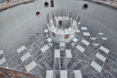 Hierbei zeigte sich Peri Up mit seinem metrischen 25-Zentimeter-Systemraster äußerst flexibel: ob als räumlich ausgebildetes Traggerüst, als 10- bis 16-stielige Kraftpakete oder als 4-stielige Schwerlaststützen. Beispielsweise konnten beim „16-Stieler“ die Vertikalstiele mit 25-, 50-, 75- und 150-Zentimeter-Horizontalriegeln eng gebündelt, dennoch aber über System-Diagonalen ausgesteift und so an die jeweilige geometrische und statische Anforderung angepasst werden. Oder das Traggerüst wurde mit rucksackartigen Auskragungen erweitert, sodass an den freien Deckenrändern eine sichere Arbeitsebene zur Verfügung stand.