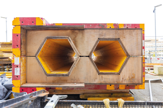 Für die als Doppel- oder Einzelstützen herzustellenden Sechseckstützen lieferte der Peri Sonderschalungsbau projektspezifisch gefertigte Stützenschalungen einsatzfertig auf die Baustelle