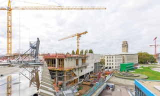 Rund um den 32 Meter hohen Bühnenturm des neuen Schauspielhauses sorgte ein projektspezifisch ausgearbeitetes Traggerüstkonzept für einen effizienten Schalungs- und Gerüsteinsatz