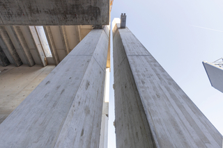 Für die als Doppel- oder Einzelstützen herzustellenden Sechseckstützen mit zwei unterschiedlichen Querschnittsabmessungen lieferte der Peri Sonderschalungsbau projektspezifisch gefertigte Stützenschalungen einsatzfertig auf die Baustelle. Die Schalungseinheiten für die Doppelstützen berücksichtigten den mit nur 20 Zentimeter äußerst geringen Abstand zwischen zwei Stahlbetonstützen. Maßgenau zugeschnittene Knaggenkästen wurden dabei werksseitig mit einer Systemschalung kombiniert: teils mit der Vario GT 24 Säulenschalung, teils mit der Maximo Struktur Rahmenschalung. Wie auch bei allen Sichtbetonwänden, sorgten 3S-Schalungsplatten für die geforderte SB4-Betonoberfläche.