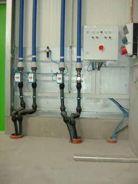 Sobald der fertig gemischte Flüssigbeton mit der Betonkübelbahn in die Gussformen transportiert wurde, muss das Mischwerk und die Kübelbahn mit dem Betriebswasser aus der Zisterne gereinigt werden. Das abfließende Wasser enthält so genannte Betonschlämme, die per Ringleitung der Mischanlage wieder zugeführt wird. Ein Tauchmotorrührwerk sorgt auf halber Strecke dafür, dass sich Feststoffe nicht absetzen. Je nach Menge und Konsistenz des im Vorlagebehälter gesammelten Waschwassers kann nach Bedarf Betriebswasser aus der Zisterne zugemischt werden. Die verschiedenen Pumpen, Wasserstandssonden und das Tauchmotorrührwerk stehen über einen zentralen Steuerschrank miteinander in Verbindung. Dies ist die eigentliche Zentrale des gesamten Betriebswassersystems, die einschließlich Trinkwassernachspeisung leicht zugänglich und Platz sparend das Wasserrecycling in der Produktionshalle verwaltet.