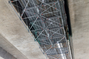 Kleinere Gerüstkonstruktionen, zum Beispiel als Zugang zu den Brückenkappen, können problemlos mit den Allround-Standardbauteilen ausgeführt werden – bei abschnittsweisem Arbeiten auch als fahrbare und damit materialsparende Konstruktion. Hier handelt es sich um eine rahmenartige, dreiteilige Hängegerüstkonstruktion – bestehend aus der Basiskonstruktion auf dem Brückenüberbau, dem abgehängten vertikalen Konstruktionsabschnitt sowie der unter der Brückenkappe liegenden, auskragenden Arbeitsplattform. Diese befindet in der Regel ca. zwei Meter unterhalb der zu bearbeitenden Arbeitsfläche. Montiert werden die sogenannten Brückenkappengerüste meist von oben per Hand – ausgehend von der Basiskonstruktion. Typisch für das Allround-Gerüst ist die Möglichkeit, im Freivorbau mit Serienteilen zu rüsten.