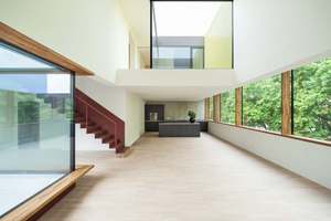 Die Decke über der unteren Ebene beinhaltet 30 cm Mineralfaserdämmung und im Terrassenbereich gleichfalls zusätzlich im Mittel 6 cm PUR Dämmung. Im Dachbereich und bei der Terrasse der unteren Ebene setzten die Handwerker in speziellen Einzelfällen auch Vakuumdämmung ein, um die vom Architekten gewünschte Schlankheit der Bauteile zu erreichen bzw. einen schwellenlosen Übergang von innen nach außen zu gewährleisten.