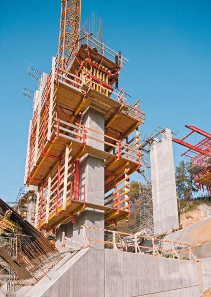Das RCS Schienenklettersystem (RCS = Rail Climbing System) für die Herstellung der Brückenpfeiler ergänzt das maßgeschneiderte Peri Baukastenkonzept für die Oparno-Brücke optimal. Ob als Kletterschutzwand zur Einhausung im Bau befindlicher Geschosse oder als kletterndes Schalungsgerüst zur Unterstützung von Wandschalungen – der RCS Baukasten ermöglicht kosteneffiziente Lösungen für unterschiedlichste Anwendungen in der Klettertechnik. Äußerst vielseitig einsetzbar, werden hier die Brückenpfeiler in Betoniertakthöhen von 3,10 bis 3,60 m mit RCS Klettereinheiten hergestellt. Das Schalungsgerüst ist mit der Kletterschiene während des gesamten Klettervorgangs immer über die Kletterschuhe mit dem Bauwerk verbunden. Ein Abdriften bei starkem Wind wird somit verhindert und es kann zu jeder Zeit schnell und sicher geklettert werden. Die Vario Träger-Wandschalung ist auf rollengelagerten Fahrwagen montiert und kann bis zu 90 cm zurück gefahren werden. Das mobile RCS Selbstkletterkonzept minimiert hierbei den Kostenaufwand für kranunabhängiges Klettern.