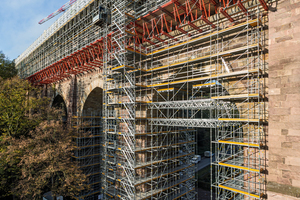Die Gloser Gerüstbau GmbH aus Walzbachtal bei Karlsruhe hat die Einrüstung exakt auf den geplanten Bauablauf angepasst. Ausgehend von der tragenden Zwischenebene mit Systemträgern des Variokit-Ingenieurbaukastens von Peri auf Höhe der oberen Brückengewölbe wird wechselseitig eingerüstet. Während auf der Westseite das Trag- und Arbeitsgerüst für den Überbau vorgehalten wird, dienen Stand- und Hängegerüste zur sicheren Ausführung der Fassadenarbeiten an der Ostseite. Ab April 2020 erfolgt der Seitenwechsel auf die jeweils gegenüberliegenden Abschnitte.
