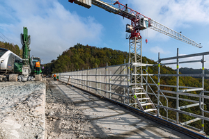 Die Stand- und Hängegerüste für die Fassadenarbeiten an den Brückenpfeilern sowie die integrierte Gerüsttreppe wurden weitestgehend mit der Stielvariante des Fassadengerüsts montiert. Oberhalb der Variokit-Zwischenlage dient die Modulgerüstvariante Trag- und Arbeitsgerüst für die Arbeiten am Brückenüberbau.