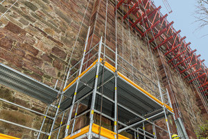 Die Gerüstbauarbeiten sind aufgrund der komplexen Bauwerksgeometrie und der engen Platzverhältnisse äußerst anspruchsvoll. Insbesondere die Ausführung als Hängegerüst in den schlecht zugänglichen Hangbereichen ist planungsintensiver und aufwändiger zu montieren als übliche Standgerüste. Deshalb trägt insbesondere die Kombinierbarkeit der beiden Baukastensysteme Peri Up und Variokit zu einer wesentlichen Erleichterung der Montagearbeiten bei. Zudem lassen sich das Fassadengerüst Peri Up Easy und die Modulgerüstvariante Peri Up Flex nahezu übergangslos miteinander kombinieren.