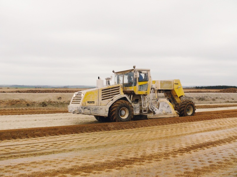 In Striegistal muss ein Gesamtvolumen von 320 000 m³ Boden einer Verbesserung unterzogen werden. Das bedeutet, dass die bodenmechanischen Eigenschaften durch die Einmischung von Kalk erhöht werden. Dadurch lässt sich der Untergrund besser verdichten und es kann ein Neubau mit höheren Traglasten erstellt werden. Die geplante Tagesleistung belief sich auf 7500 m³ – das war jedenfalls beim Baustart so. Mittlerweile werden 10 000 bis 12 000 m³ bearbeitet. Die Aufgabe des Bomag MPH 125 hier ist Weißfeinkalk einzumischen – durchschnittlich 10 kg/m². Dieser wird von einem Streufahrzeug auf die entsprechende Lage aufgeschüttet. Gemischt wird mit natürlichem Boden, der lehmhaltig und in diesem Fall relativ feucht ist. Deshalb nimmt das Bodenlabor Baugrund Sachsen täglich eine Wassergehaltsbestimmung vor und es wird aktuell entschieden, wie viel Kalk je Quadratmeter notwendig ist, um die optimale Untergrundqualität zu erreichen.