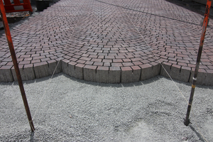 Das Ingenieurbüro favorisierte schnell das neue Creano Plus Segmentbogenpflaster aus der Reihe des Einstein-Pflastersystems. Es überzeugte mit seinen Vorzügen und vor allem durch das Zusammenspiel von Technik und Natursteinoptik, so dass der Funken der Begeisterung schnell auch auf die Verantwortlichen aus Politik und Rat der Stadt übersprang. So fiel einvernehmlich die Entscheidung, das Creano Plus Segmentbogenpflaster für die Hauptflächen einzusetzen. Diese Pflastersteine aus Beton zeichnen sich dadurch aus, dass sie mit farbbeständigem Naturstein im Vorsatz, ohne Fase und mit allseitigen Verbundnocken beziehungsweise Verschiebesicherung sowie mit der schon erwähnten D-Punkt-Fugentechnik gefertigt sind.