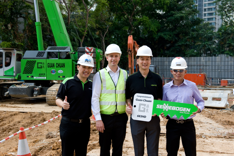 Die Guan Chuan Engineering Construction PTE Ltd. hat sich als Dienstleister auf den anspruchsvollen Einbau von Spundwänden und Fundamentarbeiten spezialisiert. Dank langjähriger Erfahrung und Spezialequipment ist Guan Chuan in der Lage, selbst bei äußerst schwierigen Bedingungen, wie hartem Gestein oder erschütterungsempfindlichen Bereichen, Spundwände einzutreiben. Zum Einsatz kommt dabei ein so genannter Crush Piler, der hängend an einem Sennebogen 683 Raupenteleskopkran montiert ist. Die Besonderheit bei dieser Art der Spundwandmontage ist das gleichzeitige Aufbohren des Untergrunds mittels einer Bohrschnecke und das Eintreiben der Spundwände. So können selbst die schwierigsten Bodenbeschaffenheiten überwunden werden, und die Methode ist im Vergleich zu konventionellen Vibratoren betont leise und vibrationsarm.