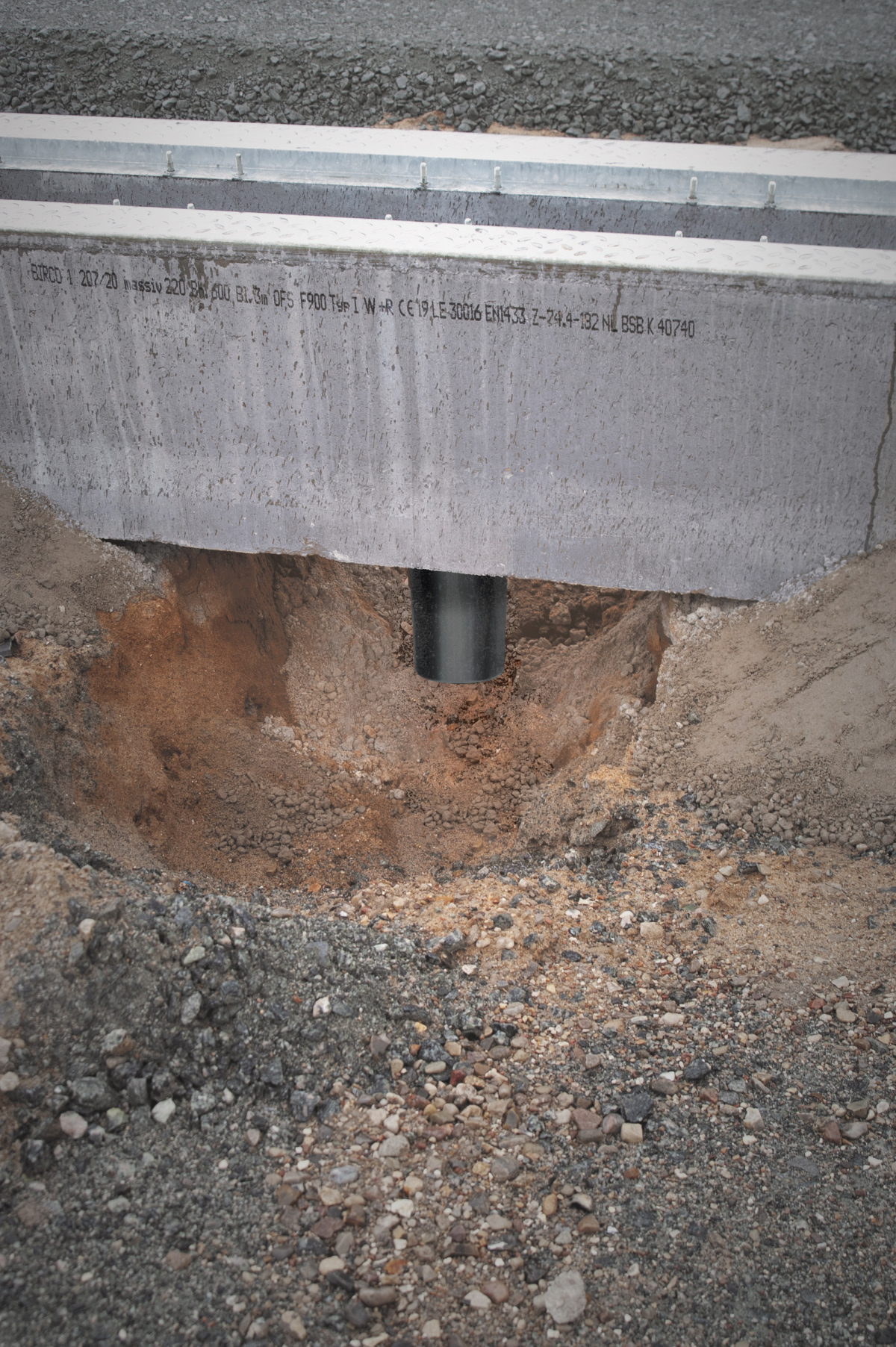 Damit Oberflächenwasser nicht seitlich am Betonkörper versickern kann, wurde bauseits eine Dichtfuge (Bitumendichtung mit Vergussmasse) angebracht. Die einzelnen Baukörper verfügen über eine Nut- und Federausformung, welche ebenfalls mit einem Dichtband bzw. einer Dichtmasse entsprechend den Vorgaben des WHG abgedichtet werden können. Durch eine geometrische Optimierung der Nut-Feder-Kontur ist eine Verlegung von „oben“ möglich. Das ist auf den ersten Blick wenig spektakulär, hat aber erhebliche Auswirkungen auf die Verlegegeschwindigkeit. Durch das passgenaue, stirnseitige Setzen des Rinnenelements an das vorherige, ist nicht nur eine sichere, sondern vor allem auch eine wirtschaftliche Verlegung möglich. Das wird durch die 3m-Bauteile noch zusätzlich unterstützt. Auch in Punkto Sicherheit ist eine Besonderheit erwähnenswert: Das Entwässerungssystem ist auf der gesamten Einbaulänge kraftschlüssig mit dem angrenzenden Unterbau verbunden. Ein Aufschaukeln und Lösen ist faktisch ausgeschlossen. Durch die Auskragung des Rinnenelements im unteren Bereich des Rinnenkörpers ist gleichzeitig ein Aufschwimmen unmöglich.