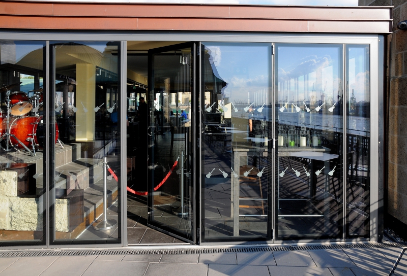 Auf den großzügigen Dachterrassen mit Blick auf die Elbe und vor den schwellenlosen Türen wurden zwei Ausführungen der Aco Profiline-Entwässerungsrinnen aus Edelstahl mit einer Breite von 13,0 cm installiert. Als Abdeckung der Rinnenkörper wurden Stegroste aus Edelstahl gewählt.