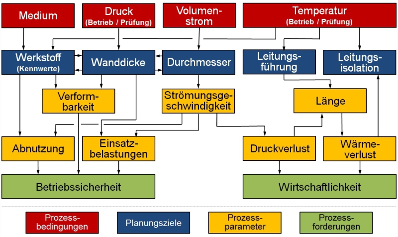 Die Höhe der notwendigen Energie wird zusätzlich von den technischen Ausführungen der Rohre und somit beispielsweise von deren Material, Herstellungsart, Verbindungssystemen und Korrosionsschutzmaßnahmen sowie vom Vermaschungsgrad des Netzes, den erforderlichen Druckzonen und Regelorganen bestimmt. Durch den jahrzehntelangen Betrieb werden in vielen Fällen besonders die inneren, aber auch die äußeren Oberflächen der Rohrleitungssysteme verändert, so dass die Energieanteile für den Transport des Trinkwassers steigen und die mechanischen Festigkeiten der Rohrstränge abnehmen.