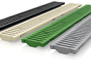 Abdeckungen präsentieren sich in Farn, Sand, Stein und SchwarzKunst am Bau, Klappe, die zweite! Nach der letztjährigen Premiere der Designabdeckung Metropolis im Jugendstil-Look erhalten die neuen Fibretec Rinnenabdeckungen nun besonders stylische Stegroste aus farbigem Granulat.