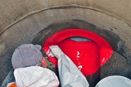 Im Schacht wird mit einem Trennschleifer die Außenfolie restlos vom Liner entfernt, um den lückenlosen Kontakt zwischen den Werkstoffen zu gewährleisten. Nachdem alle losen Materialrückstände aus dem Liner und dem Schacht entfernt worden sind, trocknet man das Umfeld der Schachteinbindung so weit ab, dass es nur noch leicht feucht ist; Harz8 RE20 ist zwar für den Dauereinsatz in feuchtem Milieu optimiert, erzielt jedoch selbstverständlich seine maximale Verbundwirkung bei Einbau auf nahezu trockenen Oberflächen. Im Hautarbeitsgang wird das markant rote Harz über eine abgeschnittene Ecke des Beutels wie aus einer Spritztülle in den erweiterten Ringraum verpresst und dort sorgfältig per Hand eingearbeitet. Bei Auftrag wurde sicher gestellt, dass das Harz sowohl die Schachtwand als auch die Liner-Innenfläche mehrere Zentimeter weit überlappt. Dies geschieht -je nach zu verarbeitendem Materialvolumen- in mehreren Durchgängen. Abschließend wird die Oberfläche befeuchtet und sorgfältig manuell geglättet. Die Reaktionszeiten des Harzes sind, beginnend mit dem Mischvorgang, so eingestellt, dass beim glätten der Abdichtung die Härtungsreaktion schon deutlich fortgeschritten, aber noch nichtabgeschlossen ist. Wenige Minuten, nachdem der Mitarbeiter den Schacht verlassen hat, kann der Schacht bereits wieder in Betrieb genommen werden, indem man die zuvor eingesetzte Dichtblase entlüftet und entfernt. Dennoch bleibt die Einbindung so elastisch, dass eventuelle Bewegungen des Liners ohne Funktionsbeeinträchtigungen aufgefangen werden könne.