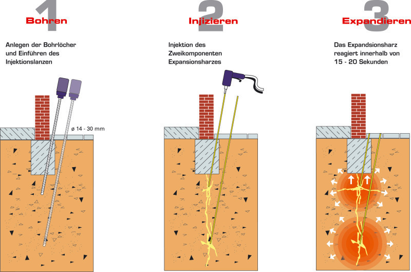 Durch die Sohle des Mittelbauwerks wurden an dem zu hebenden Bereich des Königsstuhls Bohrlöcher mit einem Durchmesser von 16 mm für die Injektionen gesetzt. In die Bohrlöcher führten die Uretek-Techniker Injektionslanzen bis etwa 3,50 m unter die Oberkante der Schachtsohle. Durch diese Lanzen wurde dann das Zweikomponenten-Expansionsharz flüssig und unter kontrolliertem Druck in den Baugrund gepresst. Während der Injektion wurden die Lanzen mit einem Ziehgerät langsam und gleichmäßig nach oben gezogen. Durch die Volumenvergrößerung der Harze (Polymerisation) und die dabei entstehende Expansionskraft (bis 2000 kN/m² in Abhängigkeit vom Widerstand der Umgebung und der Baukonstruktion) wurde der Untergrund örtlich aufgesprengt. Die Expansion der Harze erfolgte in Richtung des geringsten Widerstandes und damit genau dorthin, wo die Verstärkung notwendig war. Dabei bildeten sich vertikale und diagonale, fein verästelte Harzlamellen, die zunächst eine horizontale Verspannung im Baugrund bewirkten. Mit der so erreichten Verdichtung des Baugrundes wuchsen die Horizontalspannungen im Boden bis auf das Maß der vertikalen Auflast an. Dabei kam es lokal begrenzt zu einer messbaren Hebungstendenz von circa 0,5 mm.